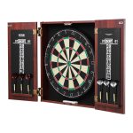 Complete official size steel tip dartboard and hideaway cabinet set with full accessories, ideal for cricket games. Easy assembly and ready to play.