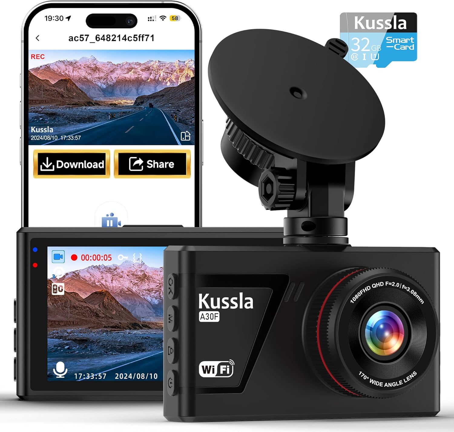High-definition 1080P front dash cam with WiFi, night vision, loop recording, G sensor, parking mode, and 32GB storage included.