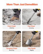 Powerful 2200W electric demolition jack hammer featuring 4 interchangeable chisel bits for versatile concrete breaking tasks.