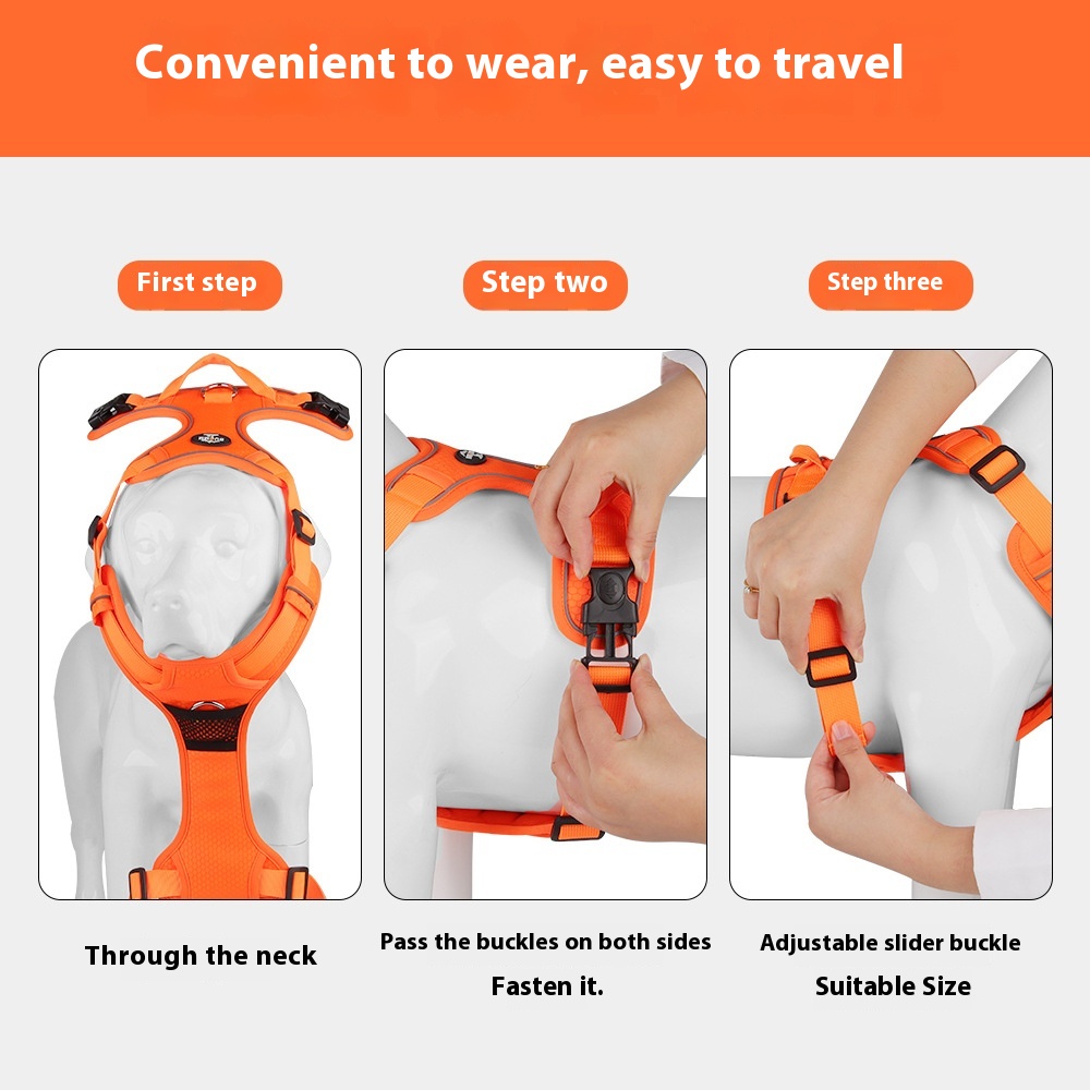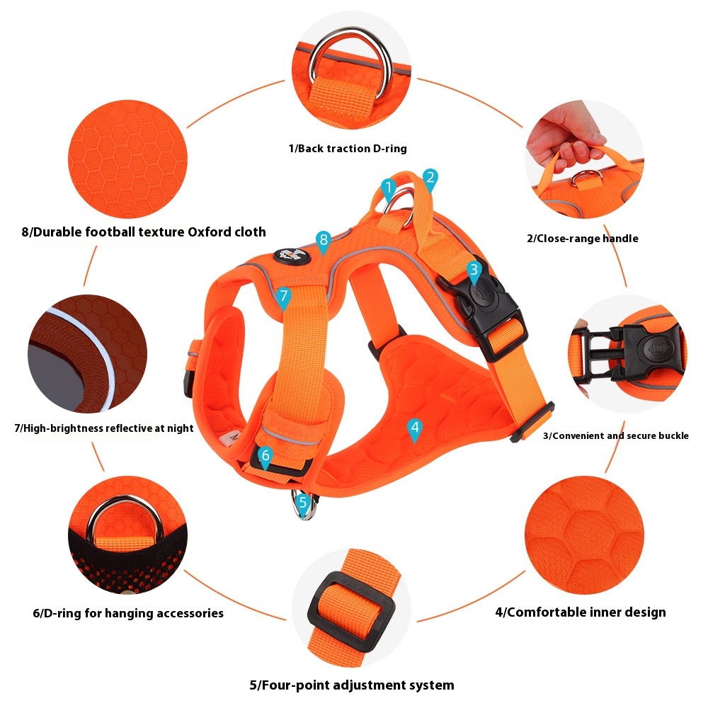 This reflective dog harness vest features a sturdy hand-holding rope designed to provide enhanced control and safety during walks. Constructed from durable, breathable materials, it ensures comfort and long-lasting use. The vest incorporates reflective elements that improve visibility in low-light conditions, making it ideal for evening or early morning walks. Adjustable straps allow for a secure and customized fit on different dog sizes. Suitable for daily outdoor activities, this harness vest promotes safe and comfortable handling of your pet.