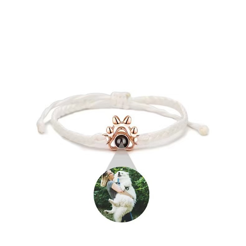 Personalized dog paw projection bracelet featuring custom color family photos and inscriptions in 100 languages for men and women.