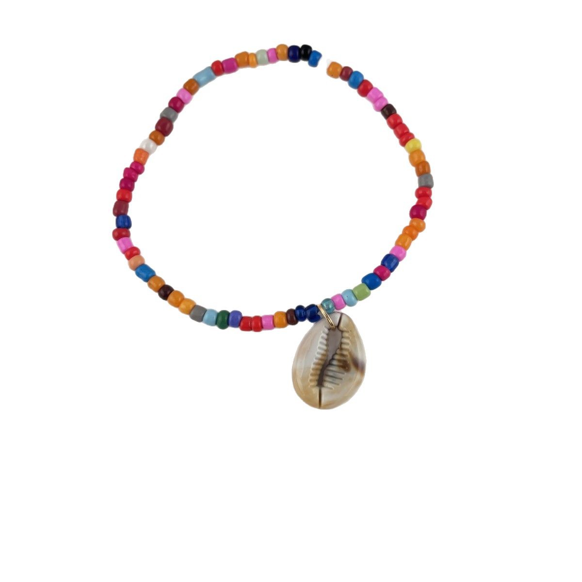 Vibrant handmade elastic bracelet featuring multicolored rice-shaped beads, combining style with comfort and flexibility.