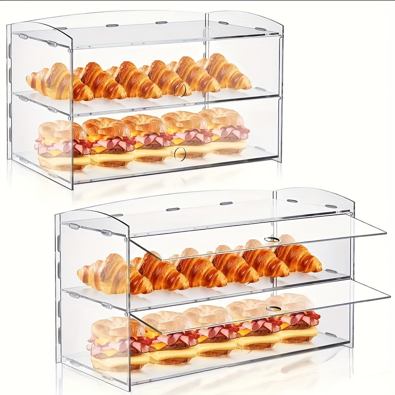 Heavy-duty acrylic bakery display case with dual layers and flip-top, ideal for showcasing pastries, donuts, and fruits while keeping them dust-free.