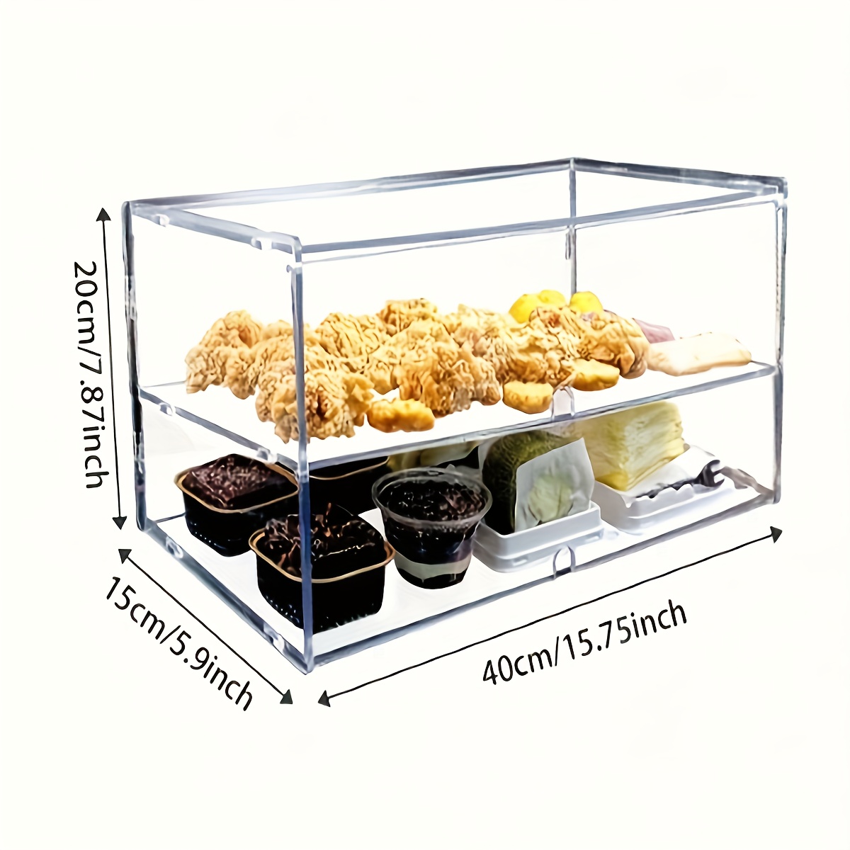 This double-layer acrylic bakery display case features a flip-top design and a sturdy lower shelf, providing ample space for displaying pastries, donuts, cupcakes, bread, and fruits. Constructed from durable and transparent acrylic material, it ensures visibility while protecting contents from dust and contamination. Its robust build makes it suitable for both commercial kitchens and home use, offering a reusable and practical solution for bakery presentation. The square shape maximizes storage efficiency, and the flip-top allows easy access while maintaining hygiene standards.