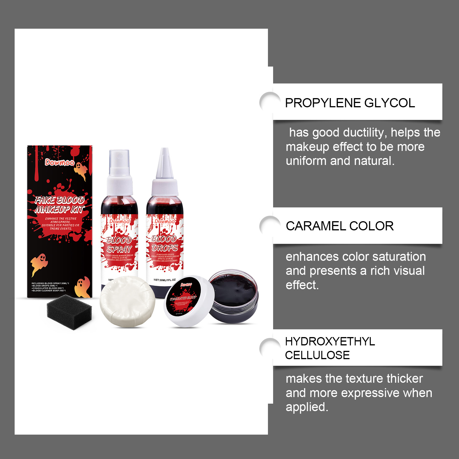 DOWMOO Halloween Fake Blood Makeup Set offers safe, realistic blood effects for spooky costumes and special makeup applications.