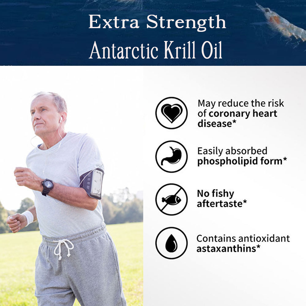 High concentration krill oil softgels with Omega-3 EPA, DHA, phospholipids, and astaxanthin for men and women, 60 capsules per bottle.