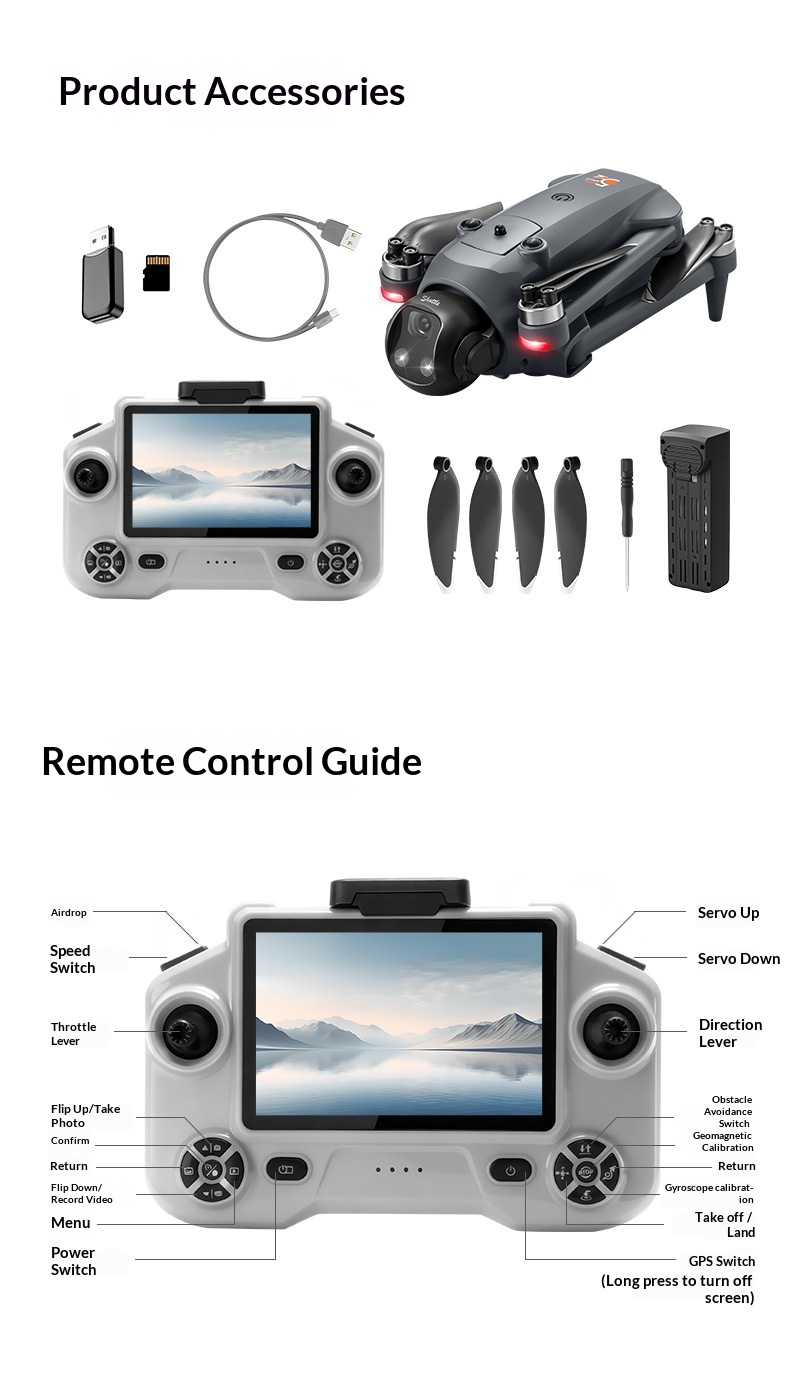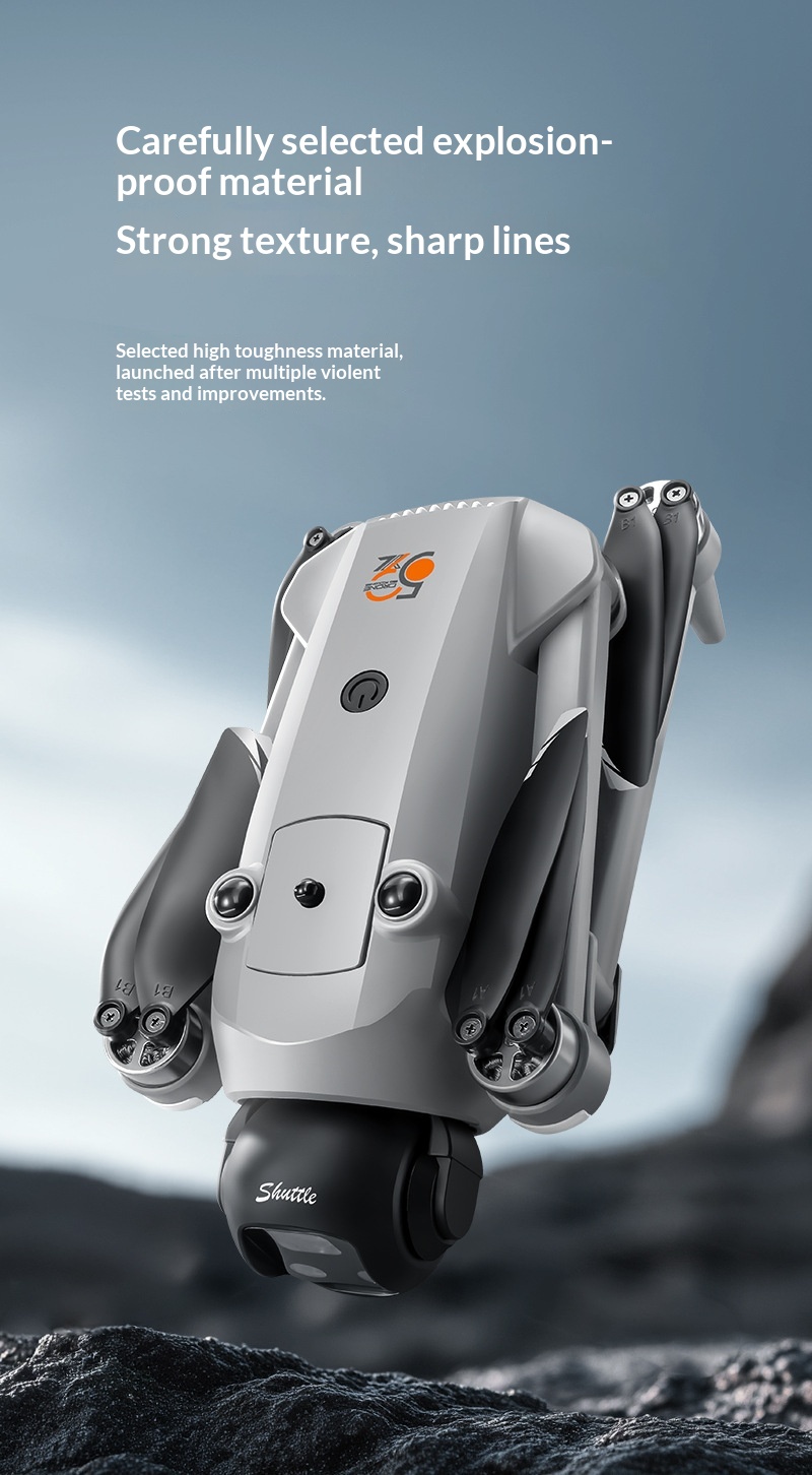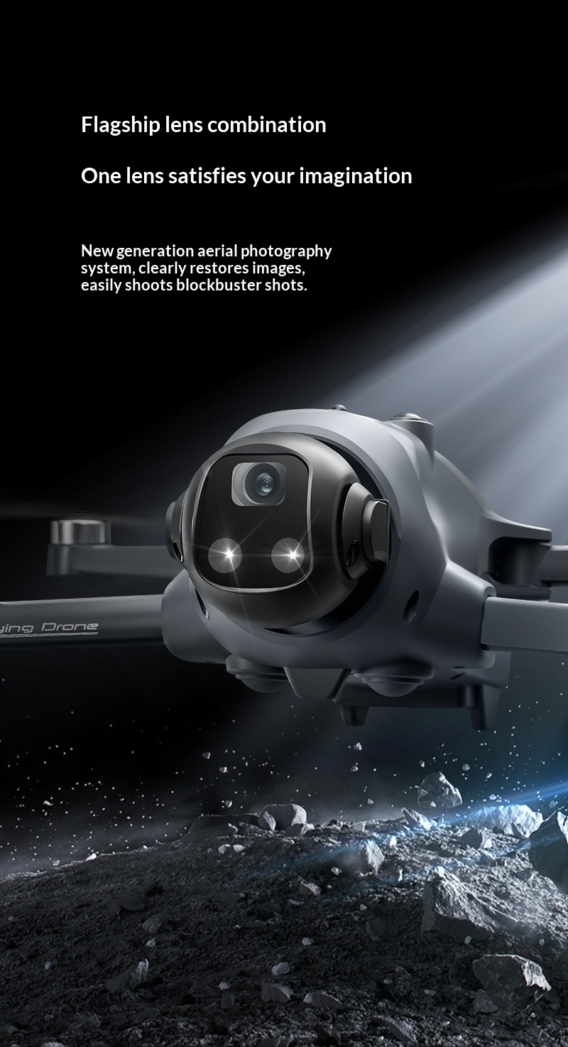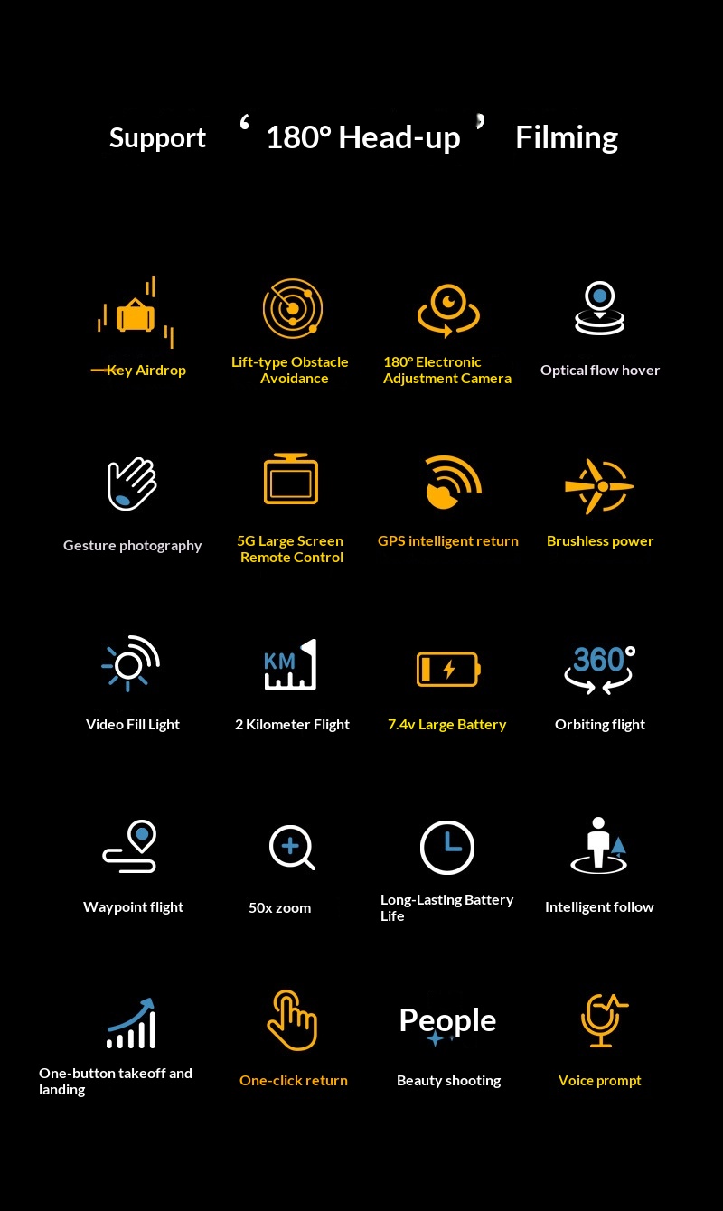 Key features: Navigation lights, USB charging, dual cameras, gravity sensing, smart sensing, drop resistance, forward flight, handle remote control, voice control, smartphone app operation, backward flight, hovering, 3D flips, shock resistance, leftward flight, rightward flight, cool lighting effects, ultra-long battery life, intelligent obstacle avoidance, barometric altitude hold, one-button takeoff and landing, gesture-based photo capture, durable propellers, automatic power-off upon collision