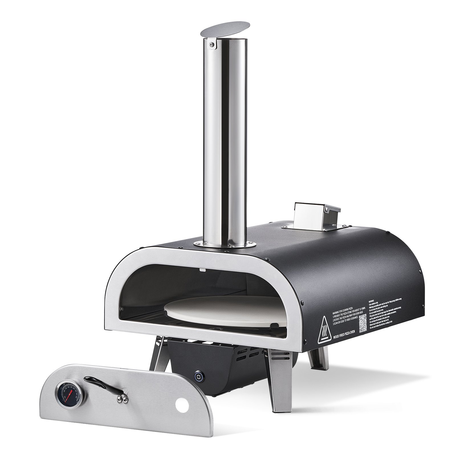 Versatile 12-inch outdoor pizza oven with wood fire and propane gas options, pellet support, thermometer, and electric rotation for perfect pizza cooking.