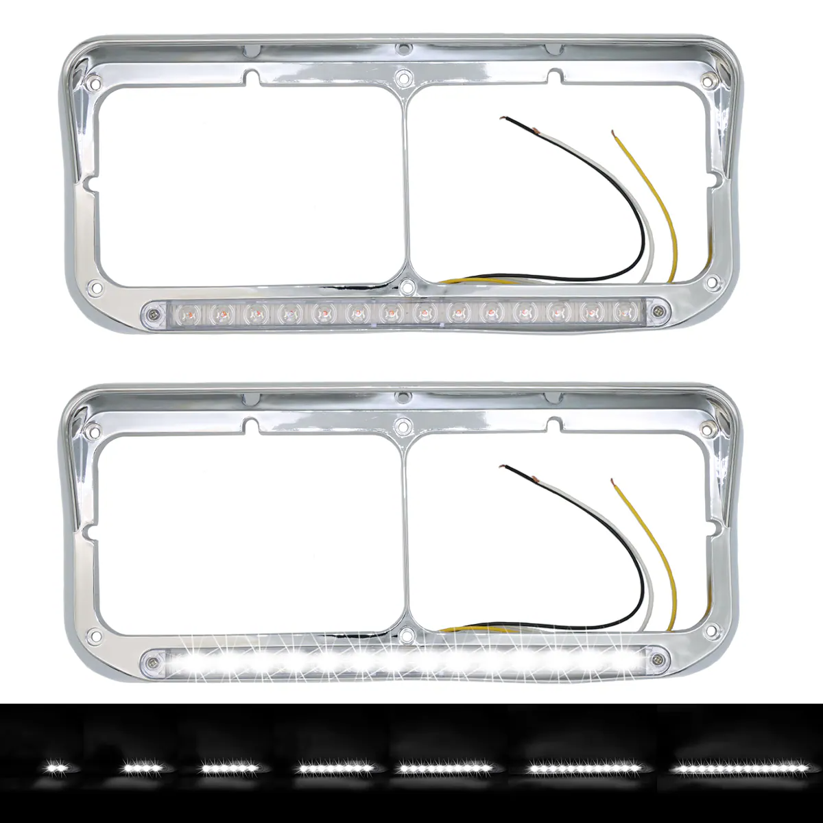 Durable dual rectangular 4×6 light headlight bezel featuring 12 amber LED strips and clear lens, compatible with Kenworth, Peterbilt, and Western Star trucks.