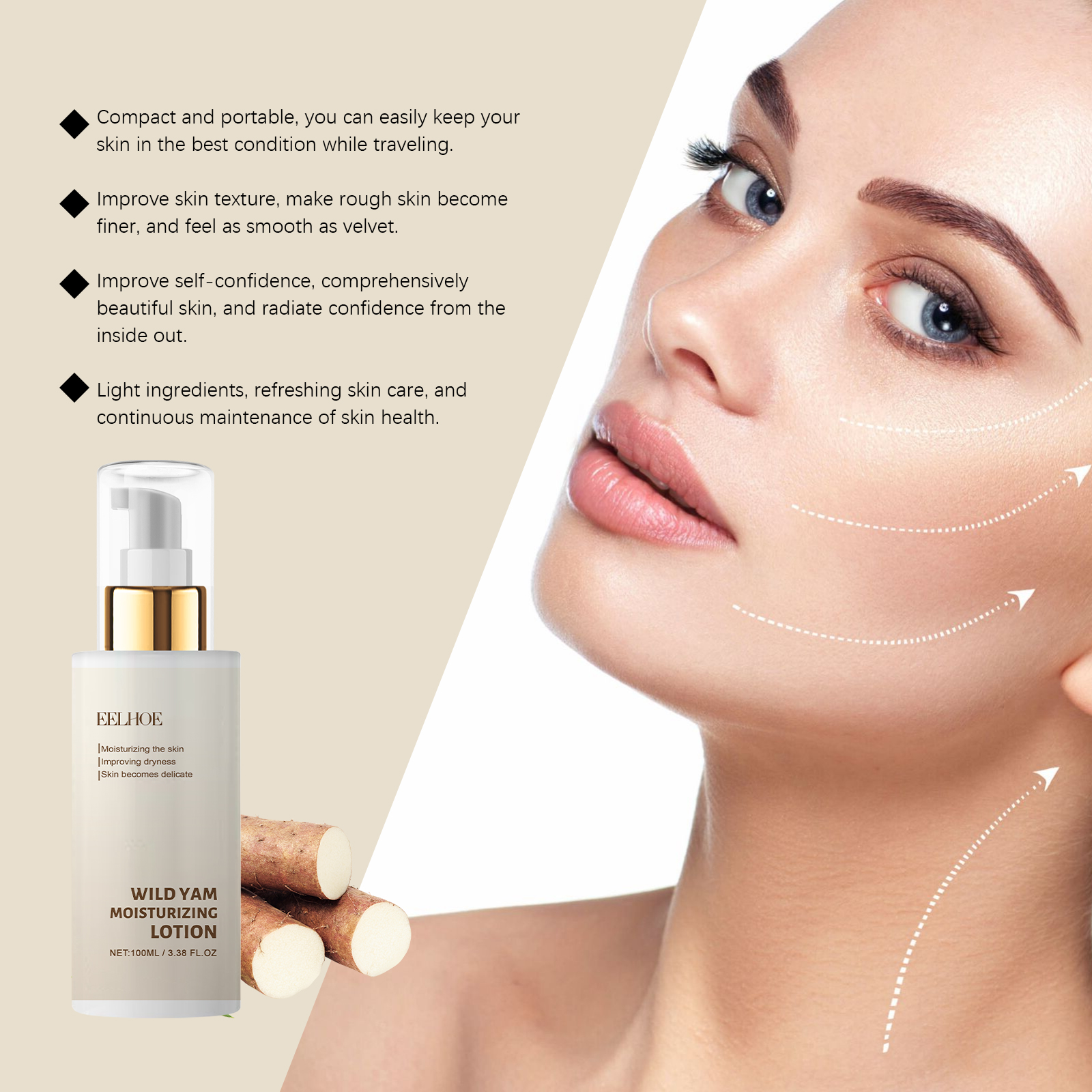 Hydrating and non-greasy EELHOE Wild Yam Lotion with anti-wrinkle benefits for refreshed, smooth skin.