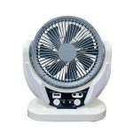 Compact, quiet electric desktop fan with rechargeable battery and portable belt for household use.
