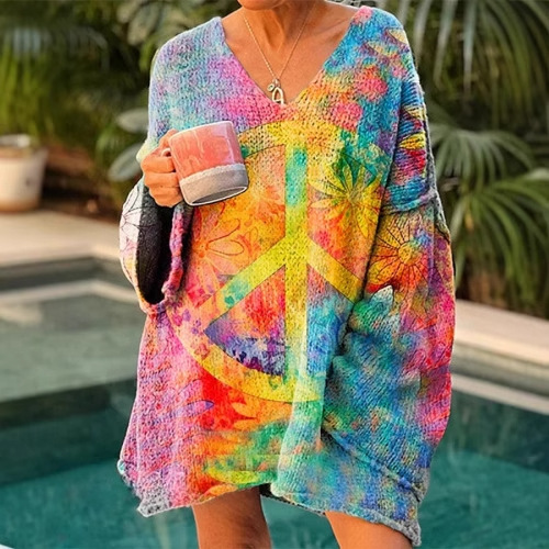 Stylish and comfortable loose-fit women’s sweater dress featuring elegant digital print, perfect for casual wear.