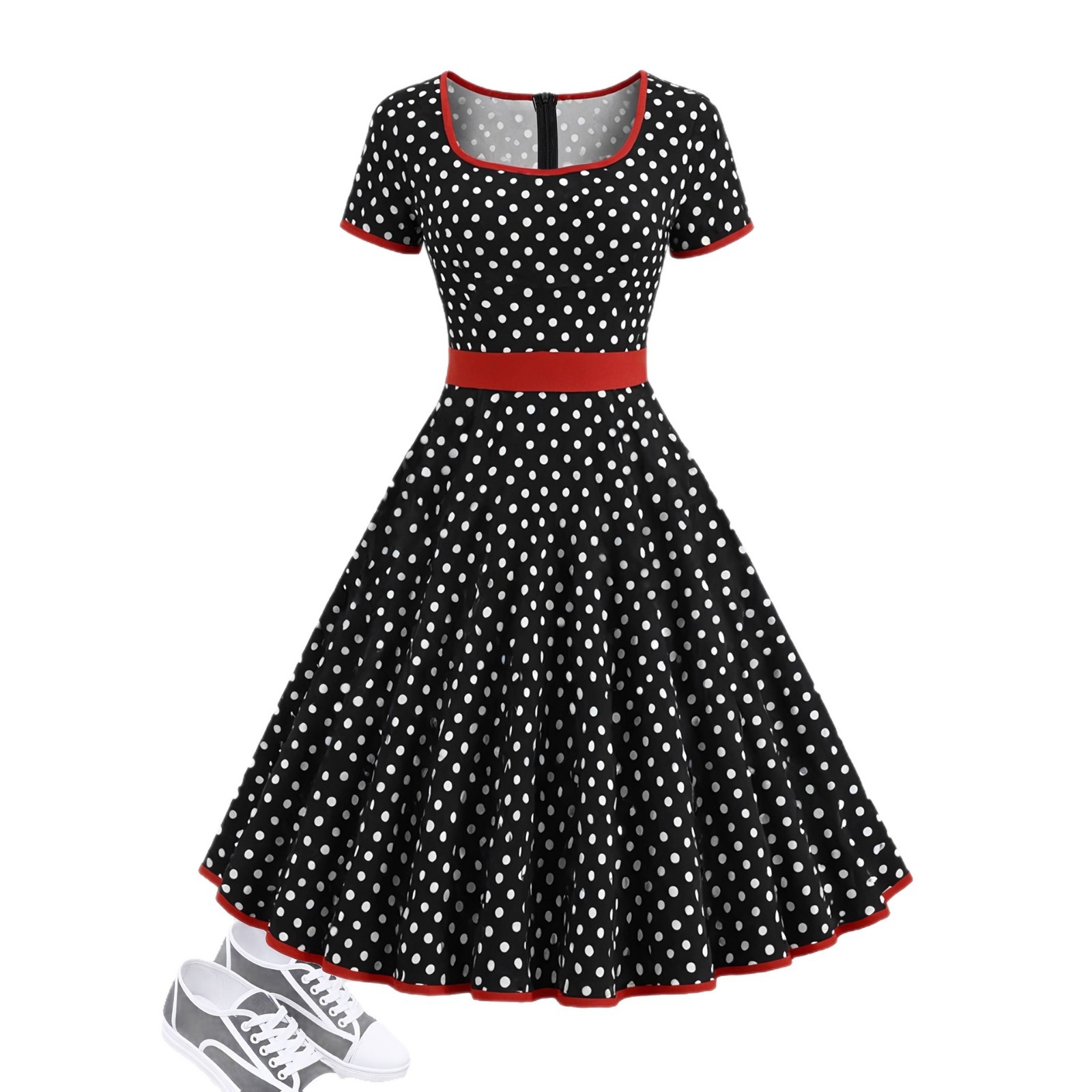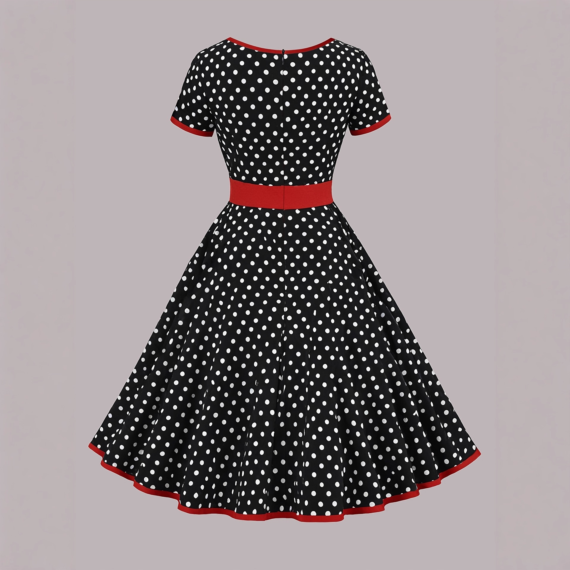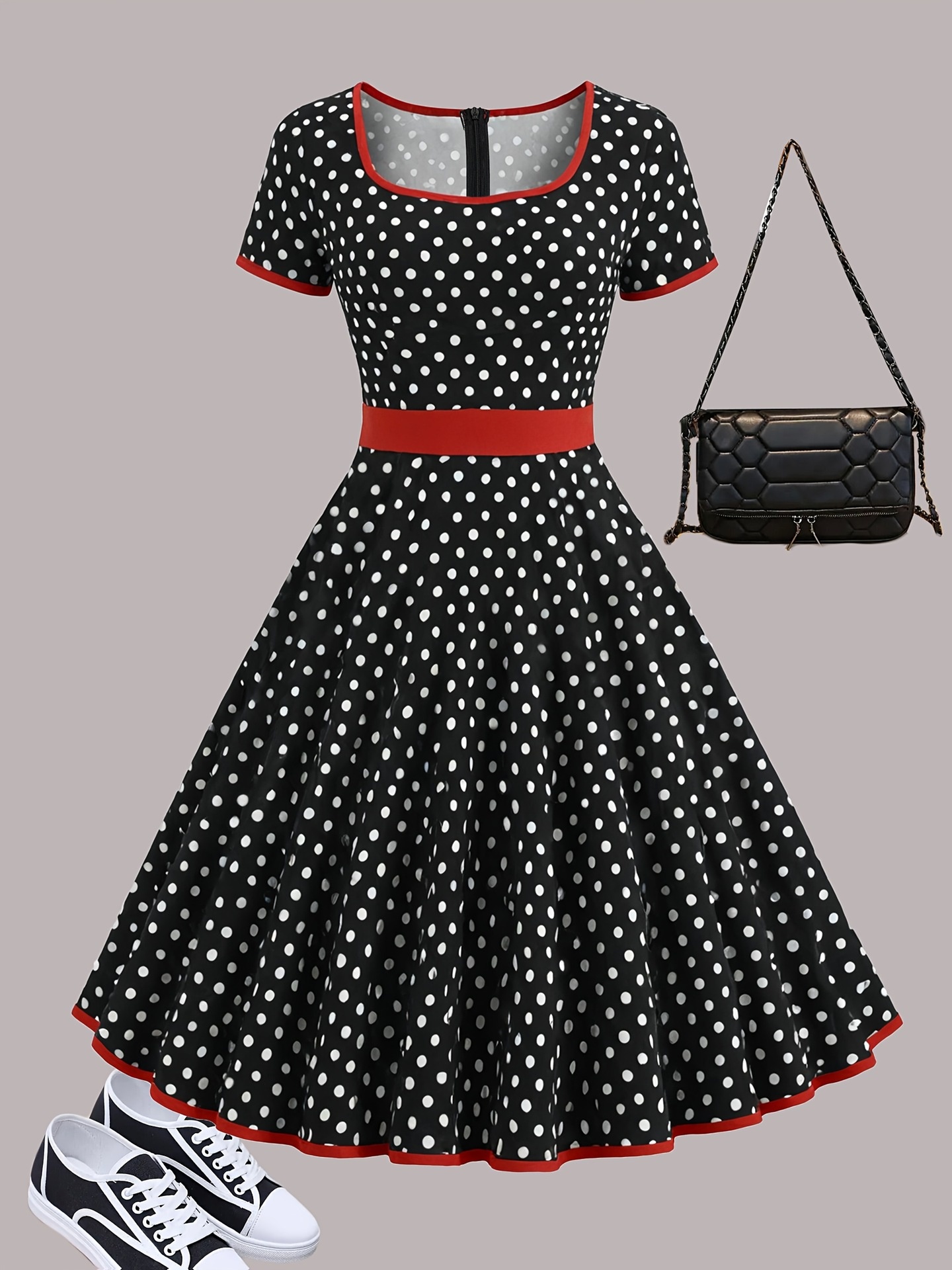 This elegant dress features a square neckline and short sleeves, crafted with a classic polka dot pattern. Designed with a functional zipper for easy wear, the garment showcases a pleated skirt that adds a touch of sophistication. Suitable for formal and casual occasions, this dress combines comfort with stylish details for a refined appearance.