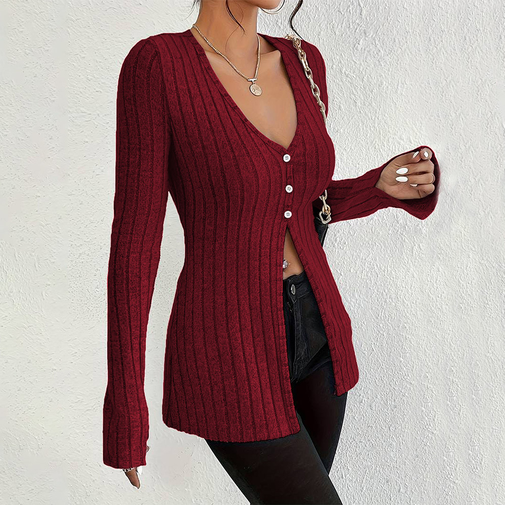 This European and American French-style crop top features a flattering V-neck and long sleeves, designed to highlight a sexy silhouette. Crafted to combine contemporary fashion with comfort, the top offers a cropped fit suitable for casual and stylish outfits. Its versatile design makes it an essential piece for modern wardrobes seeking a chic and feminine touch.