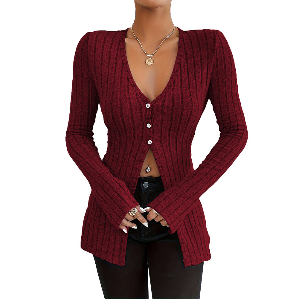 Stylish European and American French style V-neck long sleeve crop top with a sexy fit, perfect for trendy casual wear.
