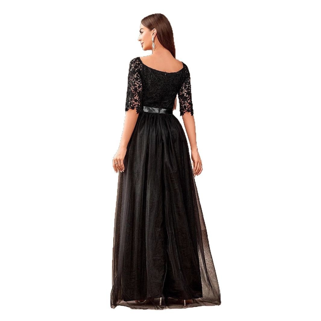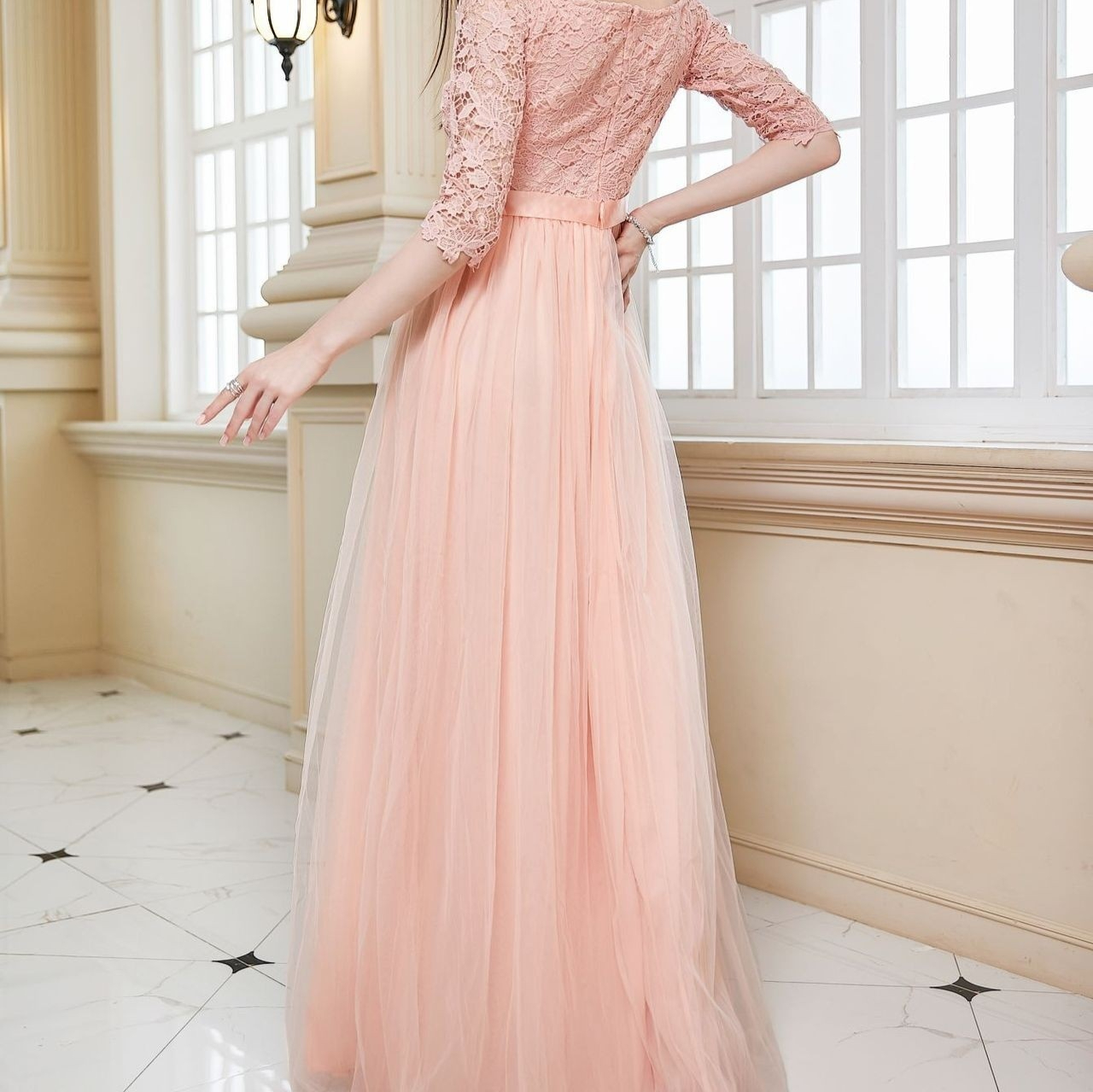 This refined princess dress showcases a V-neckline and delicate lace overlay, creating an elegant off-shoulder look. Drawing inspiration from European and American fashion aesthetics, the dress offers both sophistication and charm. Crafted with attention to detail, it highlights a flattering silhouette suitable for formal occasions, combining classic design with modern trends.