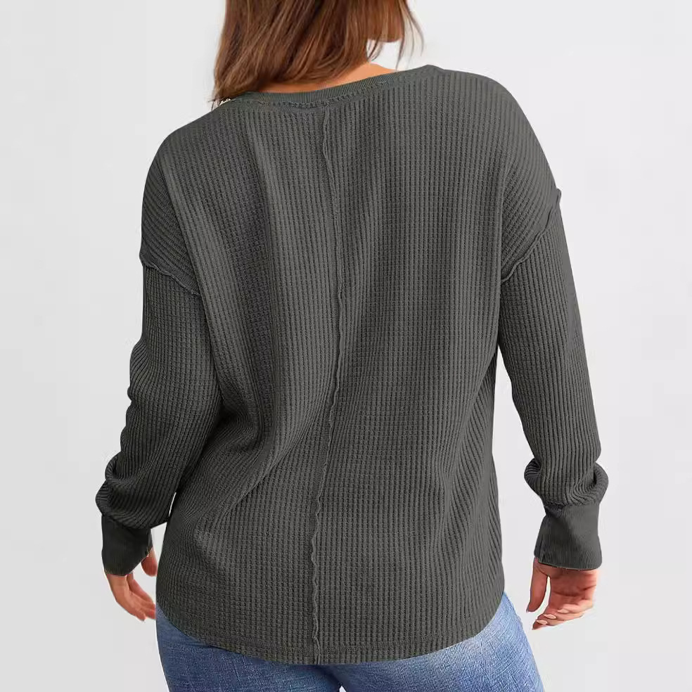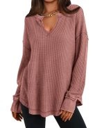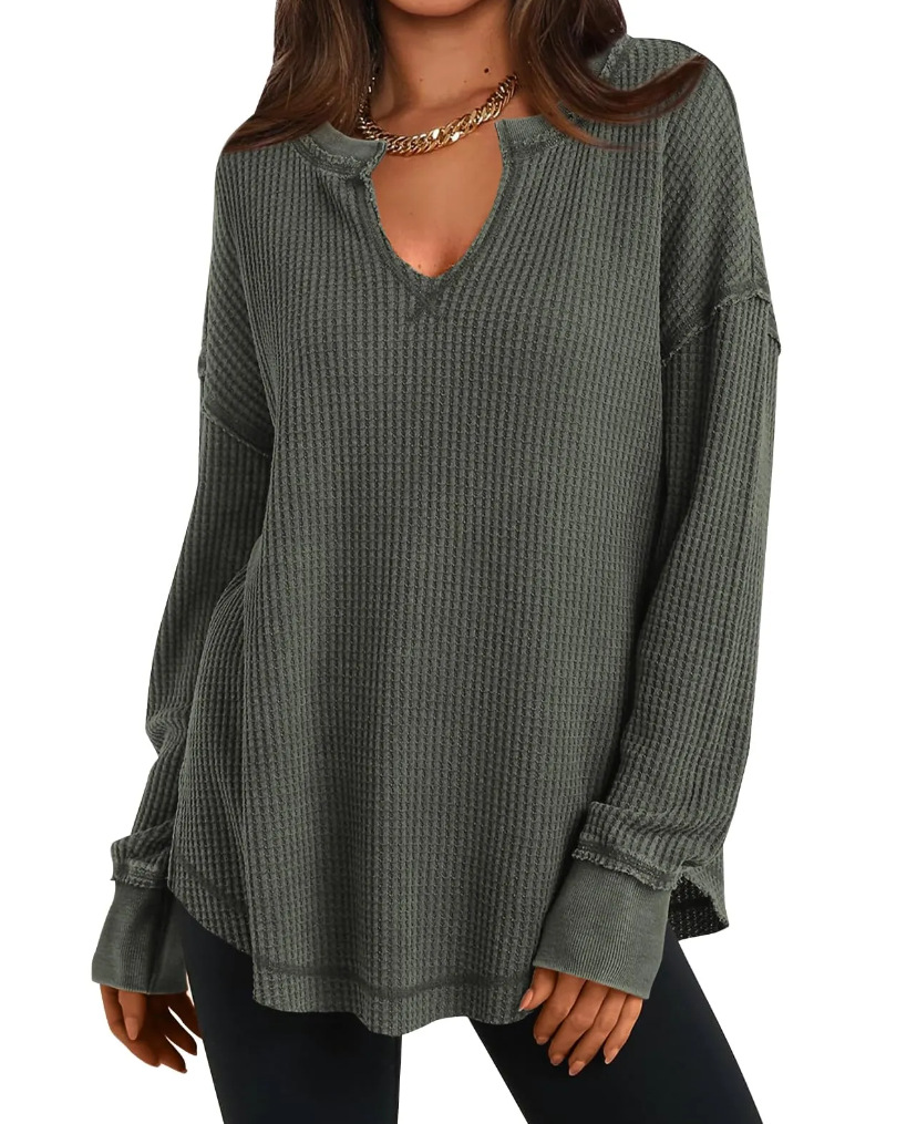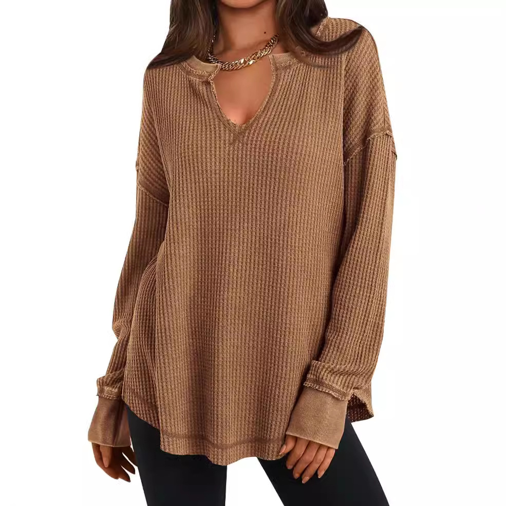 Casual solid color women’s long-sleeve V-neck loose sweater with European and American style, offering comfort and effortless elegance.