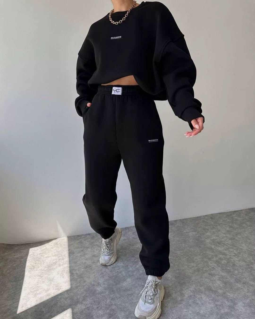 Comfortable and stylish casual round neck sweatshirt paired with matching pants set for everyday wear.