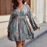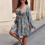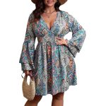 This plus size dress features a fashionable printed design combined with a flattering V-neckline, tailored specifically for fuller figures. Crafted to ensure both comfort and style, the dress includes distinctive bell sleeves that add a graceful touch to the overall silhouette. Ideal for various occasions, it complements the wearer’s shape while offering a chic and modern look.
