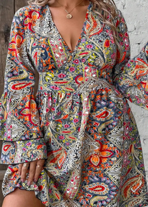 Elegant plus size V-neck dress with vibrant print and bell sleeves, designed for a comfortable and stylish fit.