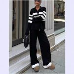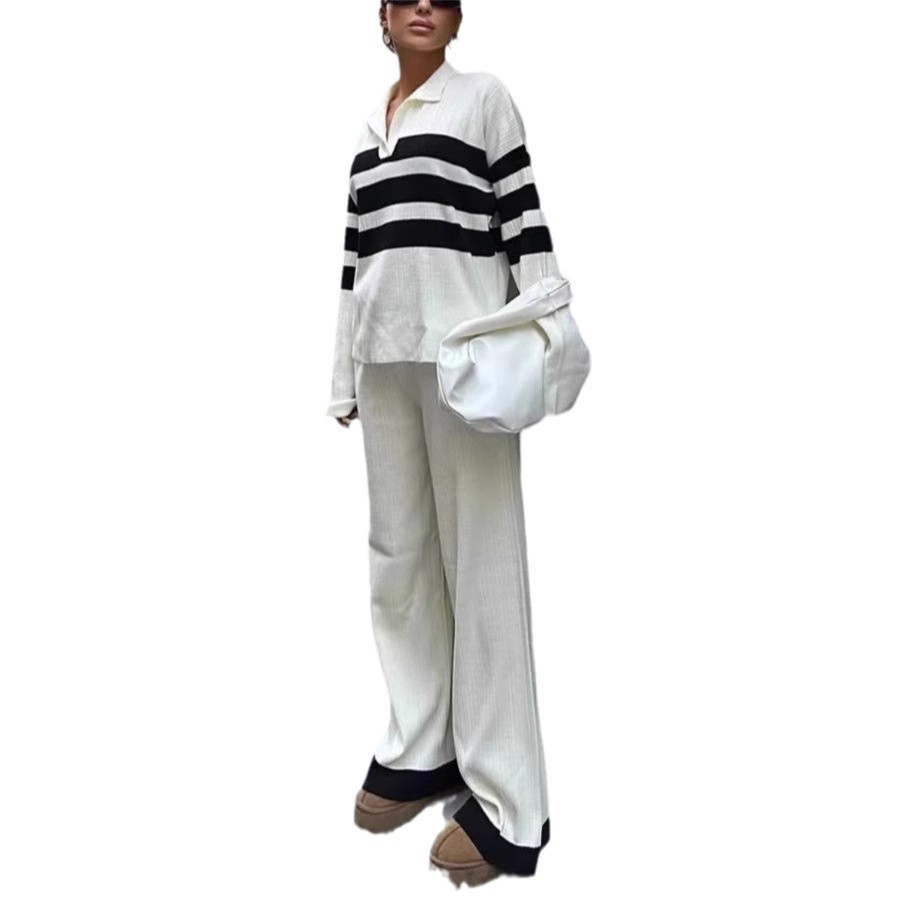Stylish women’s casual two-piece set featuring a striped polo collar and contrasting knit design for everyday comfort and elegance.