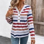 This women’s fashion top showcases a vibrant color-striped pattern combined with a V-neckline, enhanced by a decorative fastener detail. Designed with long sleeves, it offers both style and comfort, suitable for various occasions. The unique stripe motif adds a contemporary touch, making it an essential addition to any wardrobe seeking a blend of modern design and casual elegance.
