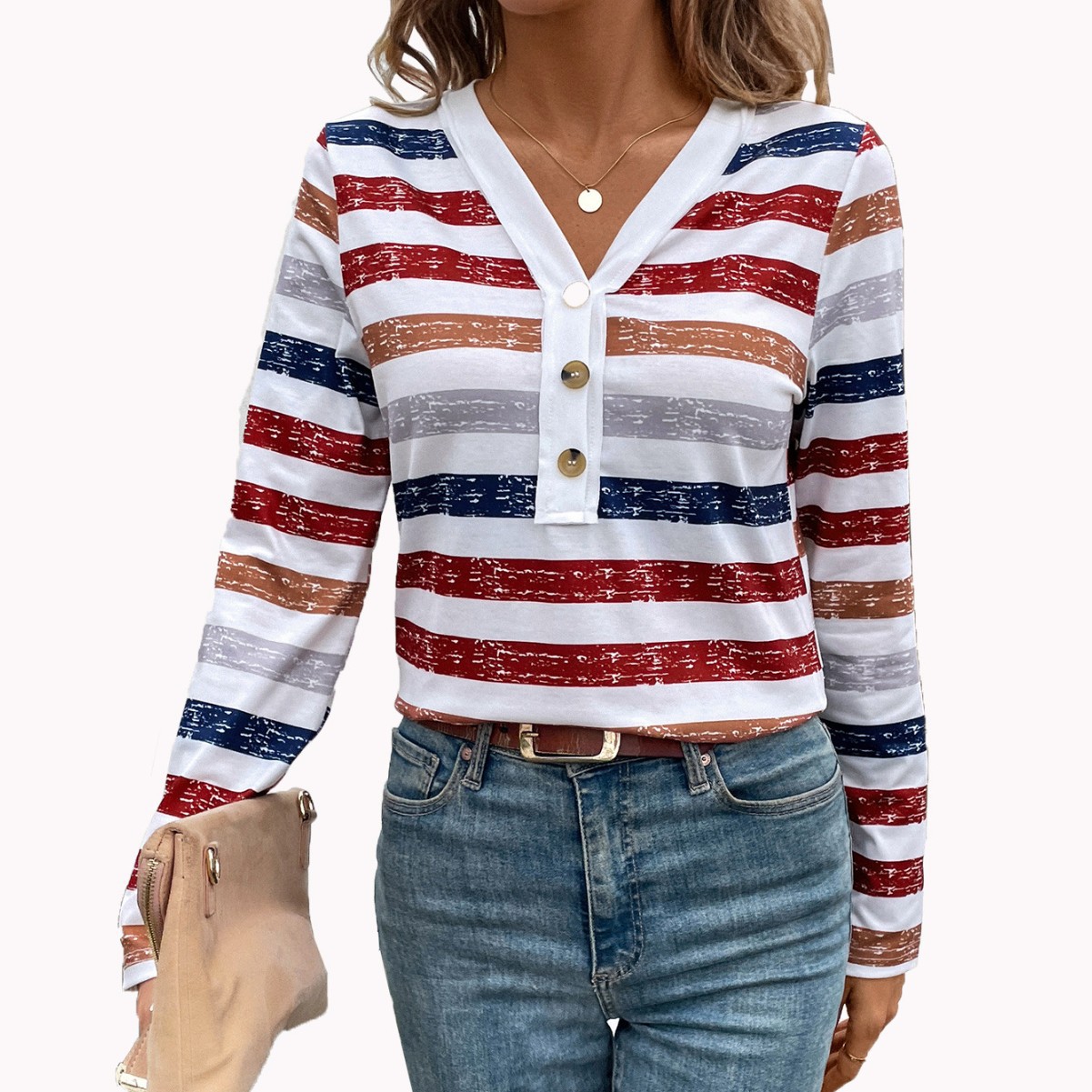 Elegant women’s long sleeve V-neck top featuring color-striped design and fastener decoration for a stylish look.