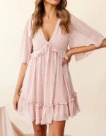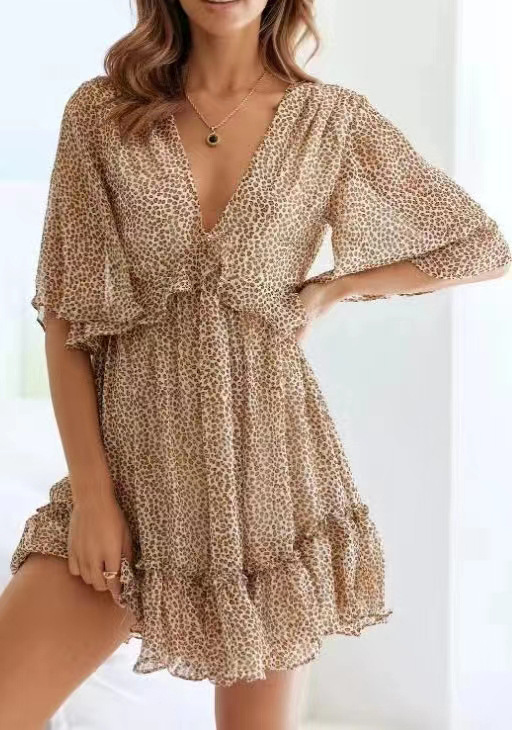 Elegant women’s printed V-neck dress featuring ruffle details for a chic and fashionable look.