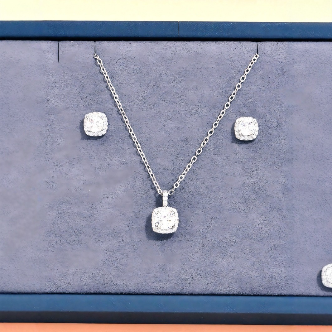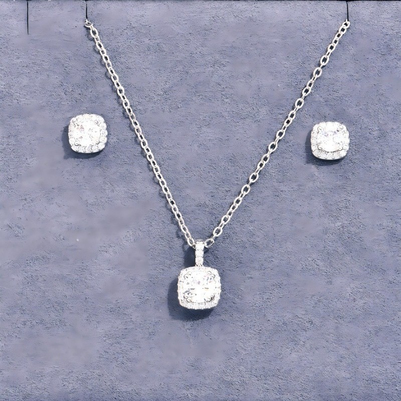 Elegant female minimalist jewelry featuring square diamond necklace and matching earrings for a refined look.
