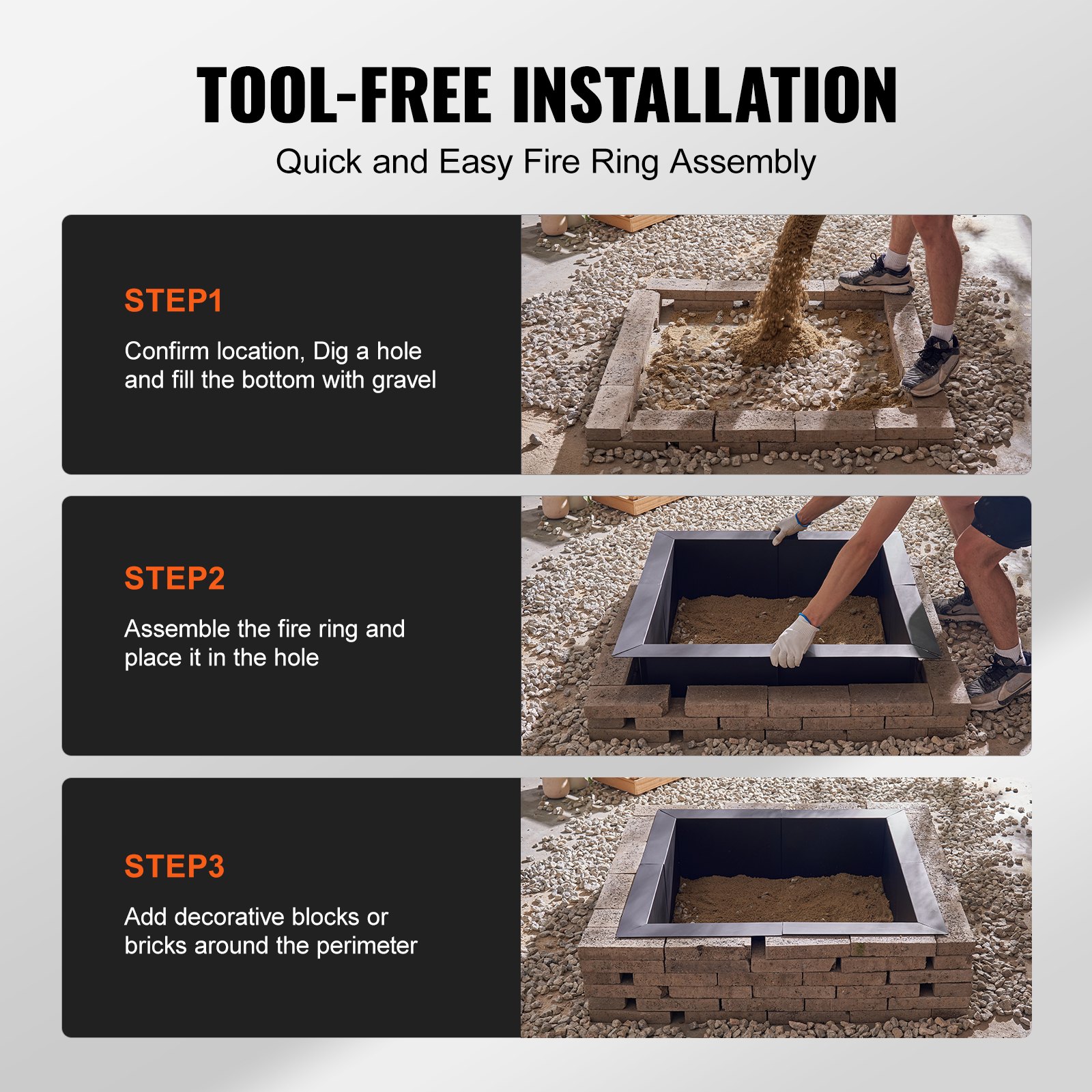 This heavy-duty fire pit ring measures 36 by 36 inches on the outer diameter with a 30 by 30 inch inner diameter and stands 10 inches tall. Constructed from robust carbon steel, it serves as a reliable liner suitable for both in-ground installation and above-ground use. Designed for outdoor camping and bonfires, this square-shaped fire pit insert provides a durable and corrosion-resistant barrier to contain campfires safely and efficiently.