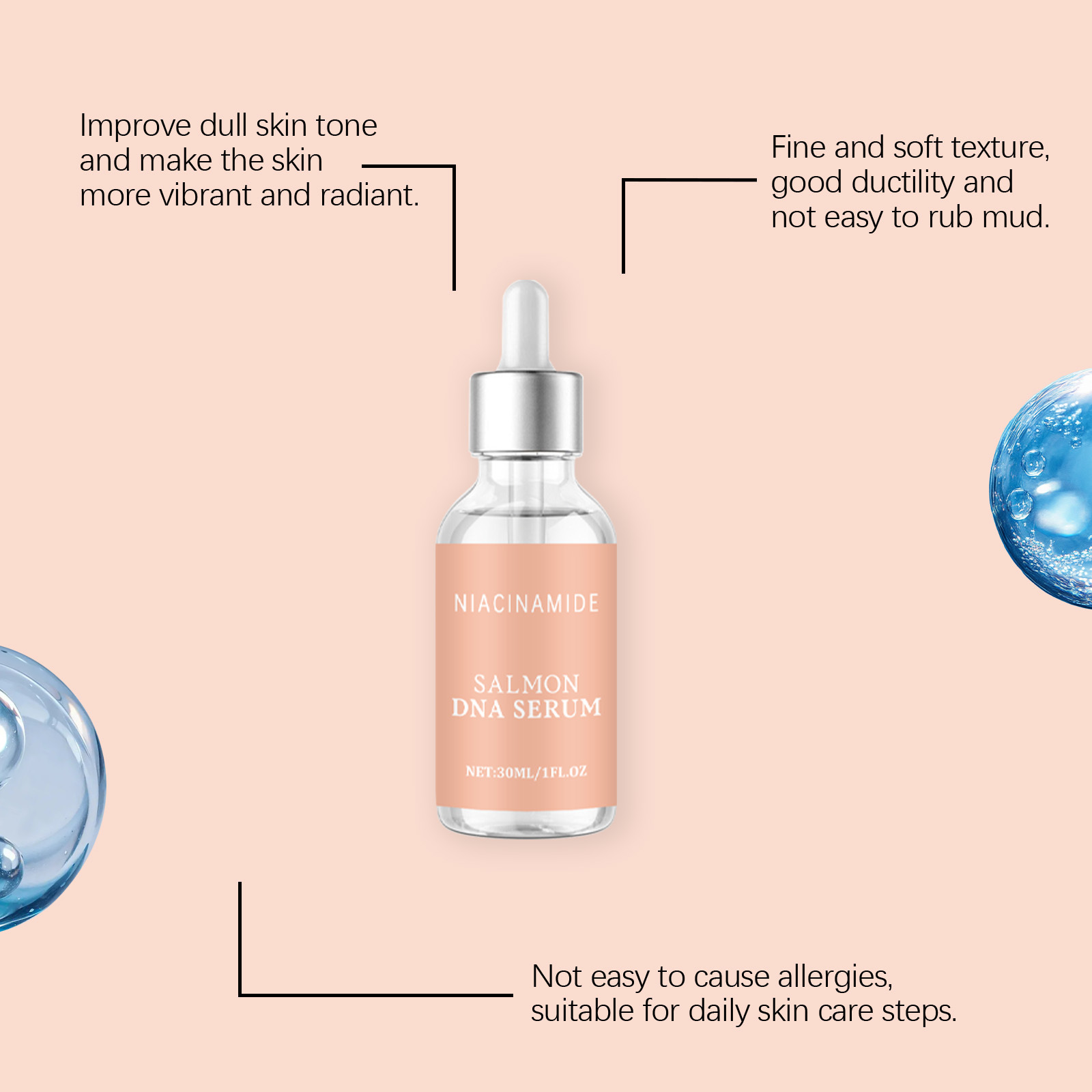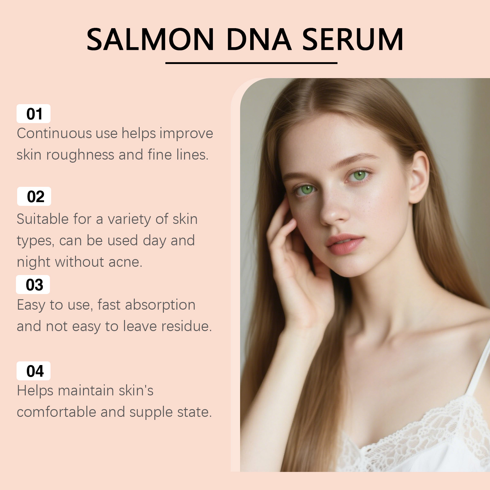 Ingredients: water, glycerin, hydrogenated castor oil, 1,2- hexanediol, carbomer, arginine, salmon egg extract, DNA sodium, palmitoyl hexapeptide -12, nicotinamide, adenosine, basil leaf extract, hydrolyzed collagen.