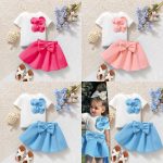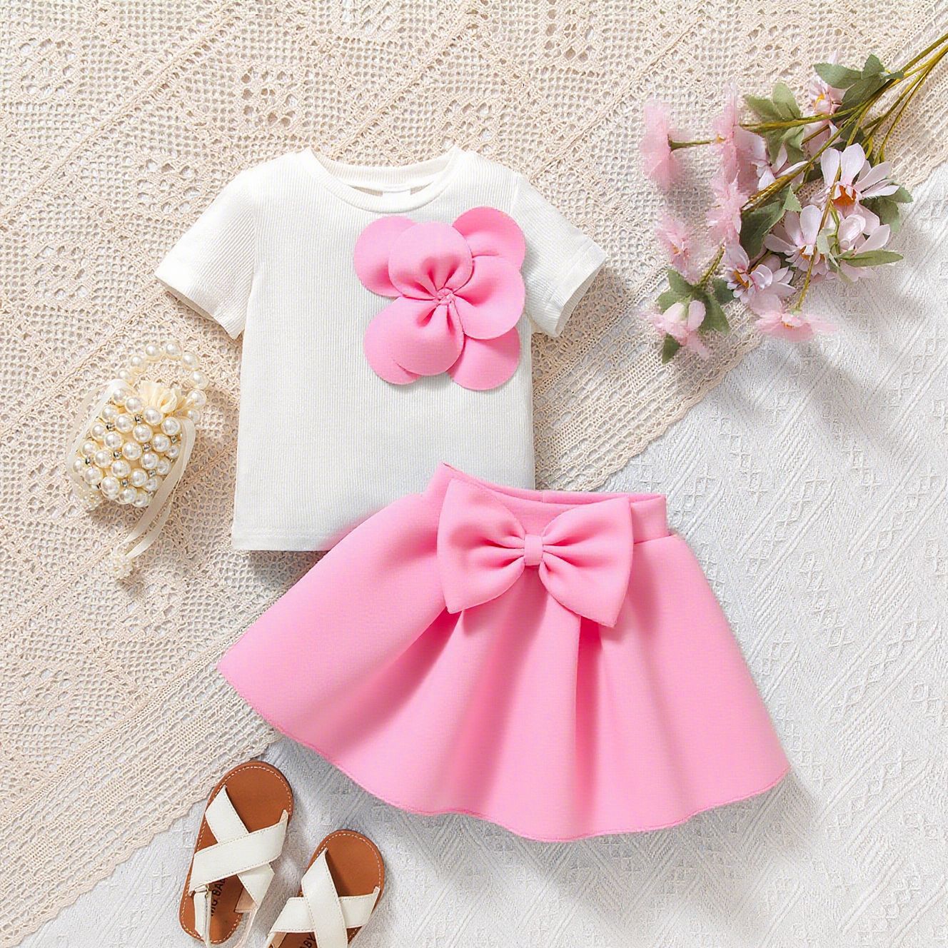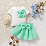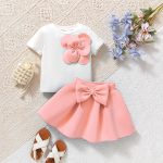 This charming set includes a short sleeve top adorned with a delicate floral pattern and a coordinating puff skirt featuring a decorative bow. Designed for comfort and style, the ensemble is ideal for casual outings or special occasions. Crafted with quality materials, it ensures durability and a flattering fit, combining playful details with a classic silhouette.