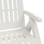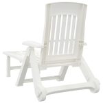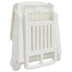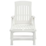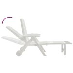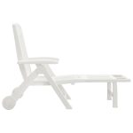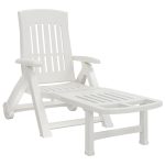 Portable white folding lounger with wheels, crafted from sturdy polypropylene for easy transport and comfortable outdoor relaxation.