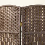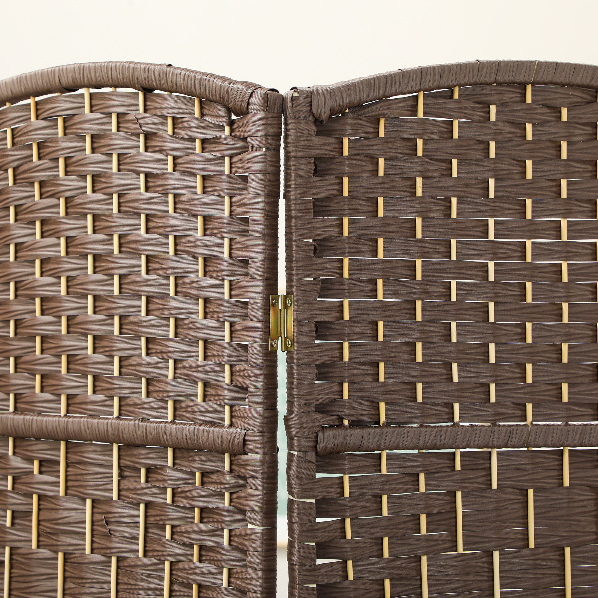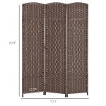This 3-panel folding room divider stands 6 feet tall, providing an effective privacy screen for both home and office environments. Crafted from durable wood with a rich brown finish, it serves as a freestanding partition that can easily be folded and repositioned as needed. Its elegant design complements various interior styles while creating distinct zones within open areas. The lightweight construction allows for convenient mobility, making it a practical solution for dividing spaces or adding privacy without permanent modifications.