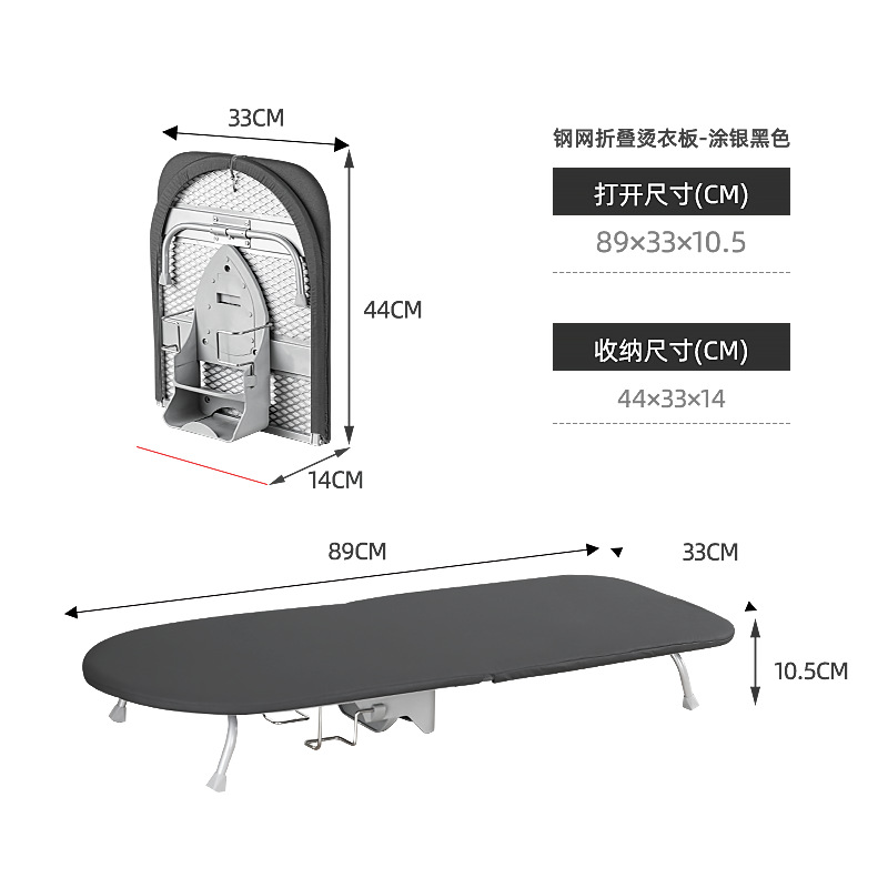 This folding household ironing board features a sturdy iron construction and an integrated storage rack designed to maximize functionality and save space. The board folds easily for compact storage, making it suitable for various home environments. Its durable surface provides a reliable platform for ironing garments, while the attached rack offers convenient storage for irons or laundry accessories, enhancing organizational efficiency. This practical design combines portability with stability, catering to everyday ironing needs.