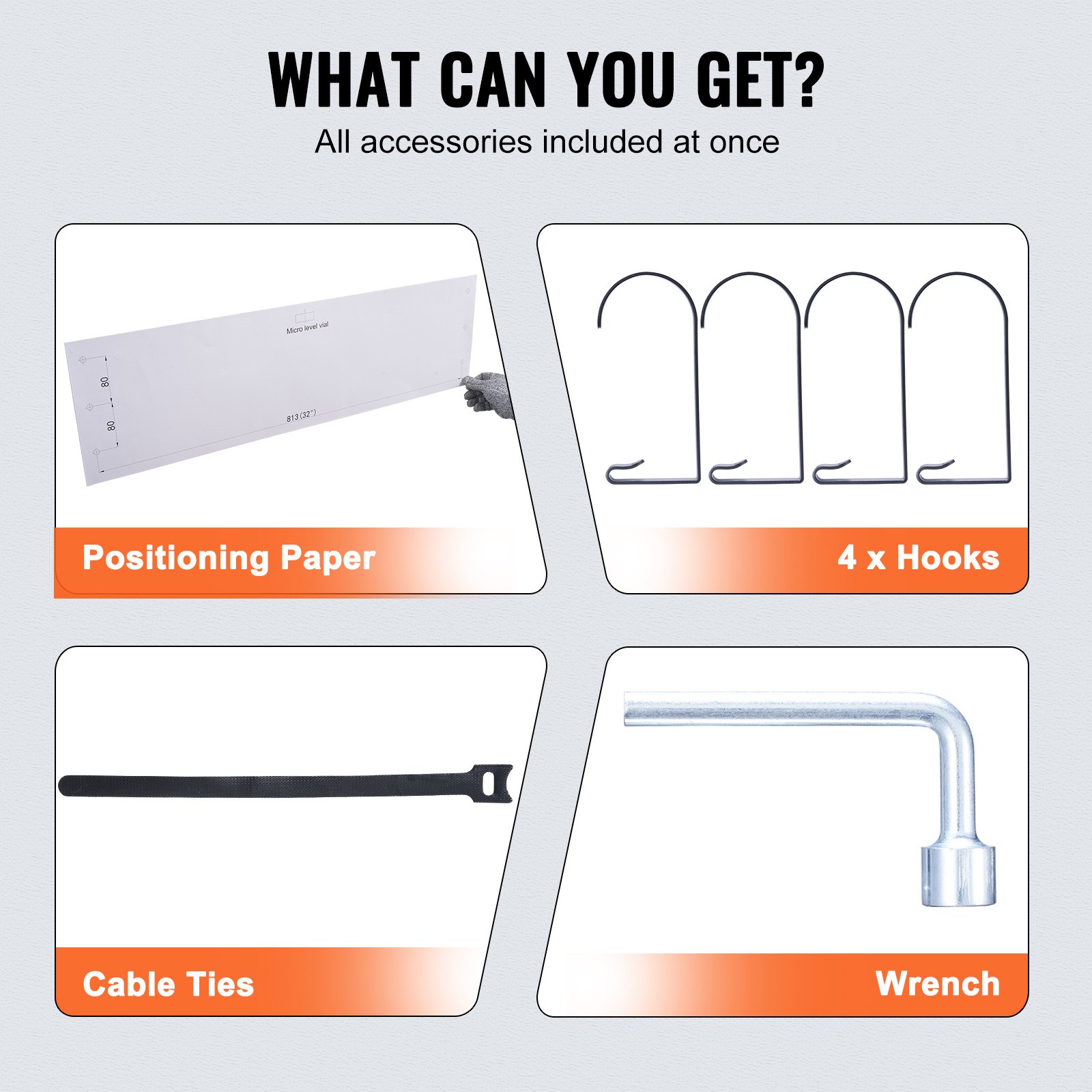 Features & Details 200 lbs High Load Capacity: Our garage wall shelving is made of high-quality metal, weighing 17.4 lbs. Each shelf has a maximum load capacity of 200 lbs, making it convenient for hanging tools. Installation Hole Spacing: 32 inches. Reinforced Construction: The garage shelving wall mounted is constructed entirely of metal with a sandblasted surface, featuring reinforced front-side beams and two additional steel wires measuring 48 x 12.3 x 4.5 inches (W x D x H) to accommodate more items. Installation Made Easy: The garage wall shelves employ a modular assembly design. Simply place the hole positioning paper, install the brackets, tighten the screws, and you’re good to go. The lower tool rack can be separated from other organizers according to your specific needs. Everything You Need: The package includes positioning paper, hooks, cable ties, etc. This garage shelving heavy duty wall mounted is suitable for installation on concrete or wooden walls. If it’s a stud wall, please check the hole distance and not suitable for installation on metal walls. Neat & Efficient: Still struggling to find a place for your tools or dealing with clutter everywhere? VEVOR garage hanging shelves are perfect for organizing screwdrivers, handheld power tools, batteries, and chargers. Create a clean and tidy workspace, making you feel more comfortable and productive.