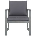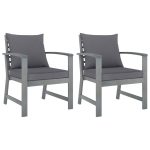 Durable acacia wood garden chairs set of 2 with comfortable dark grey cushions, designed for outdoor relaxation and style.