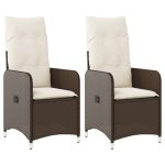 Set of 2 adjustable brown poly rattan garden chairs with comfortable cushions, perfect for outdoor relaxation and durability.