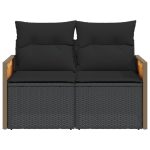 Durable 2-seater garden sofa with black poly rattan frame and comfortable cushions, perfect for outdoor relaxation.