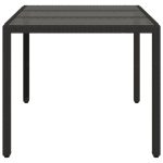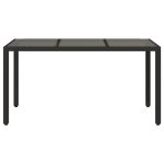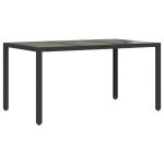 Durable black poly rattan garden table with a tempered glass top, measuring 150x90x75 cm, perfect for outdoor settings.