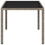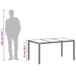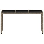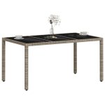 Durable light grey garden table featuring poly rattan construction and glass top, 150x90x75 cm, ideal for outdoor use.