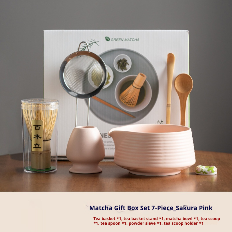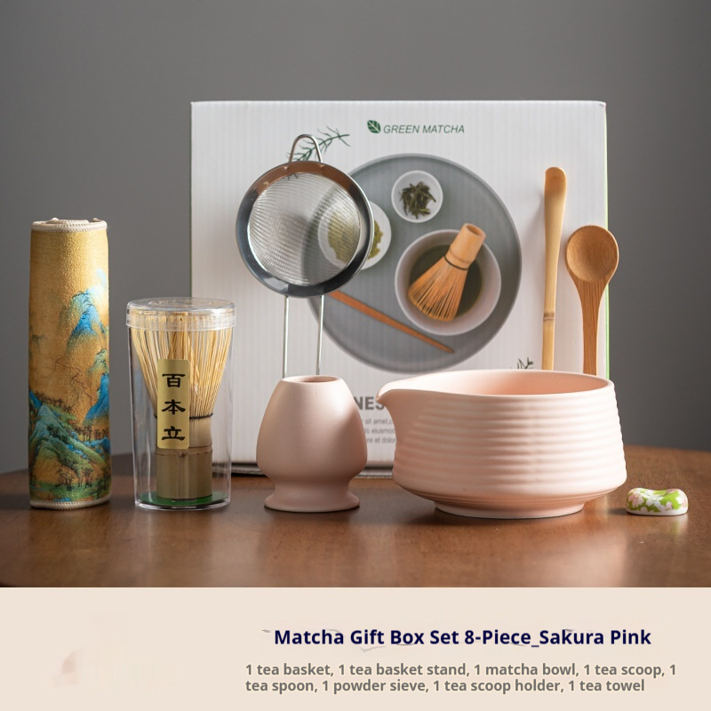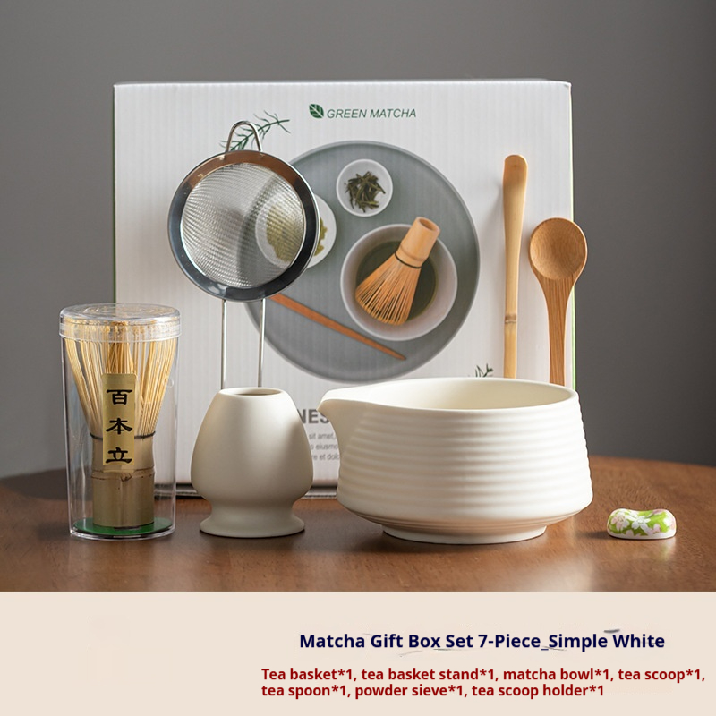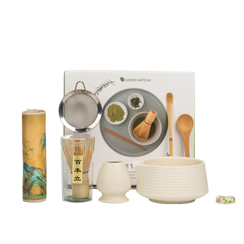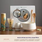 Complete matcha tea set featuring a tea whisk, bowl with spout, and a hundred stand in an elegant gift box.