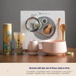This tea set includes a traditional bamboo tea whisk accompanied by a matcha bowl equipped with a convenient spout for precise pouring. The set also features a hundred stand designed to hold the whisk securely, promoting longevity and proper drying. Presented in an elegant gift box, this collection is suitable for matcha enthusiasts and offers both functionality and aesthetic appeal.