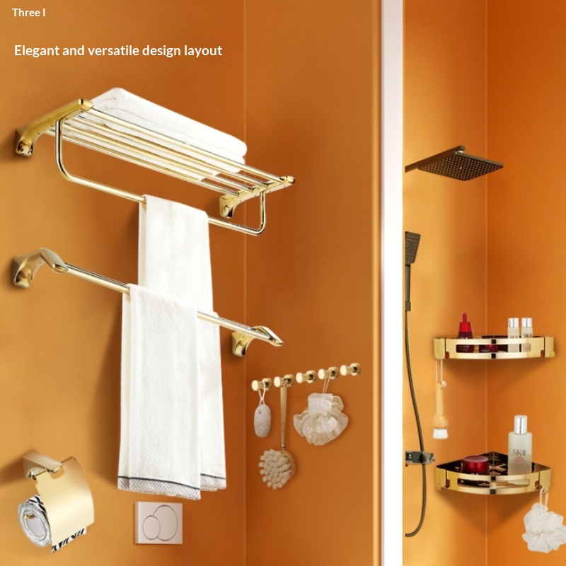This premium bathroom shelf features a luxurious golden French-style design that enhances bathroom decor gracefully. Engineered for convenience, it installs effortlessly without the need for drilling, preserving wall integrity. Crafted from high-quality materials, the shelf ensures durability and resistance to moisture, making it ideal for bathroom environments. Its spacious design optimizes storage for toiletries and essentials, combining functionality with elegant aesthetics. The no-drill mounting system offers a secure and stable fixture, suitable for various wall surfaces. This shelf is a stylish and practical addition to any bathroom space.