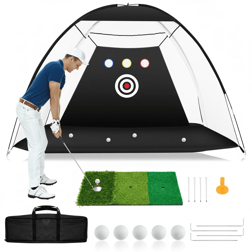 Durable 10x7ft golf practice net with three turf mats and carry bag for outdoor multi-objective training and effective practice sessions.