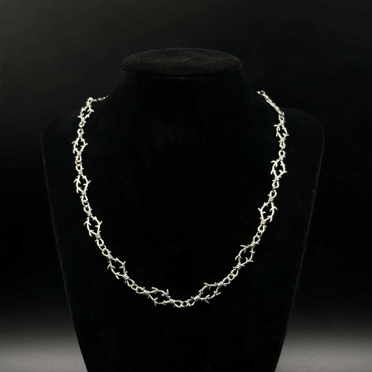 This Gothic punk necklace showcases an intricate design of interwoven thorns, crafted to rest elegantly along the clavicle. The piece combines robust metallic elements with a punk-inspired aesthetic, making it an ideal accessory for alternative fashion enthusiasts. Its carefully designed thorn pattern creates a striking visual, enhancing any outfit with a rebellious edge while maintaining refined craftsmanship. Suitable for various occasions, this necklace adds a bold statement to your jewelry collection.