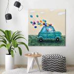 This handcrafted oil painting on canvas showcases a charming cartoon illustration of a car, dog, and balloon, creating a playful and inviting atmosphere. The artwork is unstretched and frameless, delivered rolled for easy handling and framing according to personal preference. Ideal for decorating children’s rooms or adding a whimsical touch to home interiors, the canvas art combines quality craftsmanship with vibrant colors for long-lasting visual appeal.
