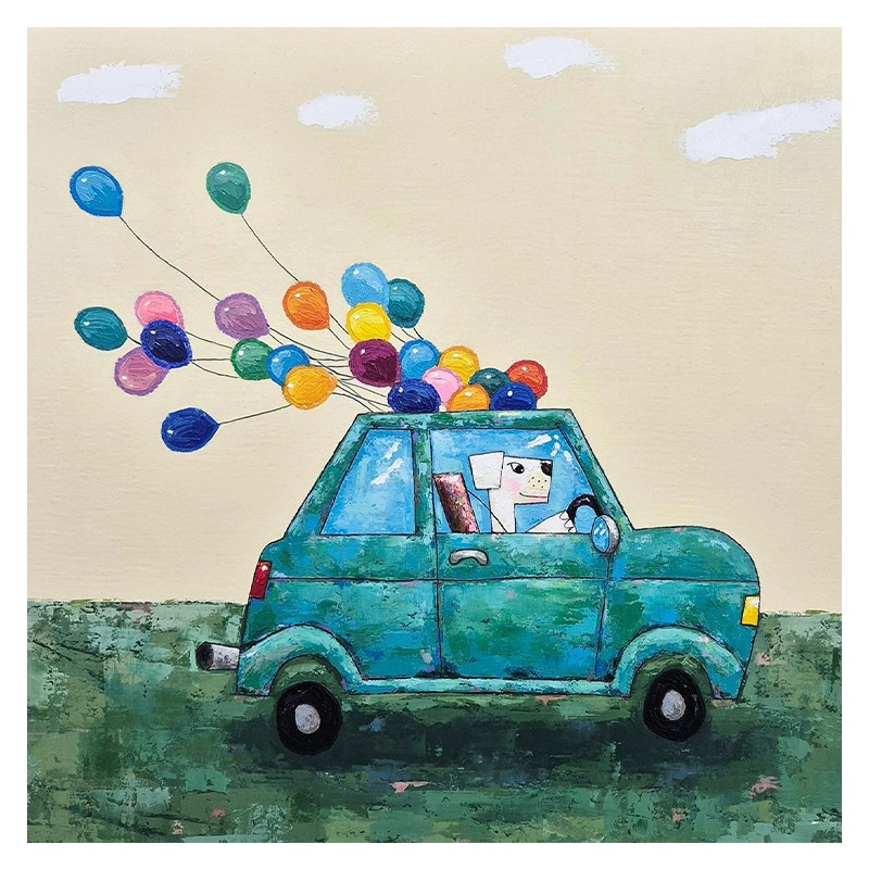 Unique handmade oil painting featuring a cartoon car, dog, and balloon on canvas. Frameless, rolled art perfect for children’s room decor.