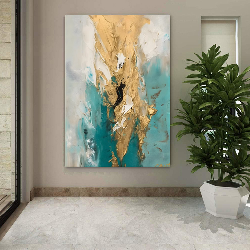 This handmade oil painting features an abstract gold design on high-quality canvas, ideal for modern home decor. The artwork is rolled and frameless, allowing for flexible display options. Measuring suitable dimensions, it adds a sophisticated aesthetic touch to any room. Crafted with meticulous attention to detail, this unstretched canvas painting serves as a stylish accent for contemporary interiors.