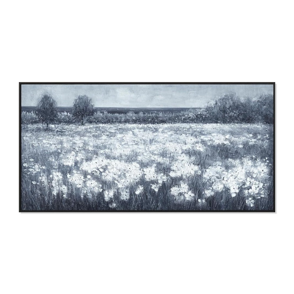 This handmade oil painting features a contemporary black and white landscape enhanced by delicate white flowers. Crafted on canvas, the artwork is presented rolled and frameless, allowing flexibility for custom framing or direct wall mounting. The unstretched canvas offers versatility in display, making it suitable for home or living room decoration with a modern aesthetic. Its monochromatic palette and subtle floral details create a serene atmosphere in any interior setting.